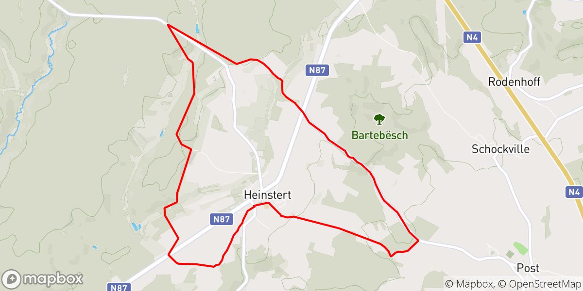 Deze wandeling van ongeveer 10 kilometer doorkruist het bos van Anlier, een van de grootste bossen van België. Op het einde van de wandeling word je beloond met een adembenemend panorama over de hele vallei. Op de oriëntatietafel vind je de verschillende dorpen terug en kom je allerlei anekdotes over de streek te weten. Vertrekpunt: Chemin des Ecoliers - 6717 Heinstert. Markering: blauwe ruit op witte achtergrond.