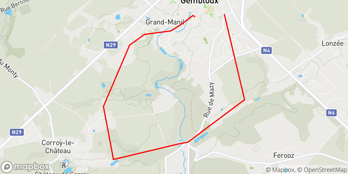 Wandeling N°1 gerealiseerd door het bureau voor toerisme van Gembloux. Volg de rode markeringen.